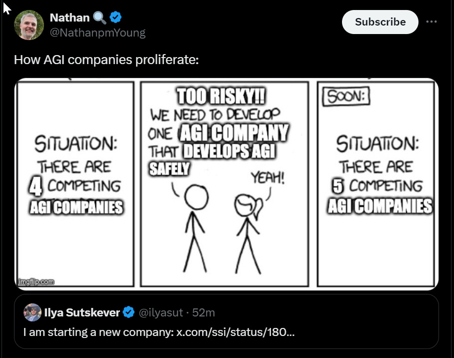 Nice job breaking it, hero, unfortunately. Ilya Sutskever, despite what I sincerely believe are the best of intentions, has decided to be the latest to do The Worst Possible Thing, founding a new AI company explicitly looking to build ASI (superintelligence). The twists are zero products with a ‘cracked’ small team, which I suppose is an improvement, and calling it Safe Superintelligence, which I do not suppose is an improvement.