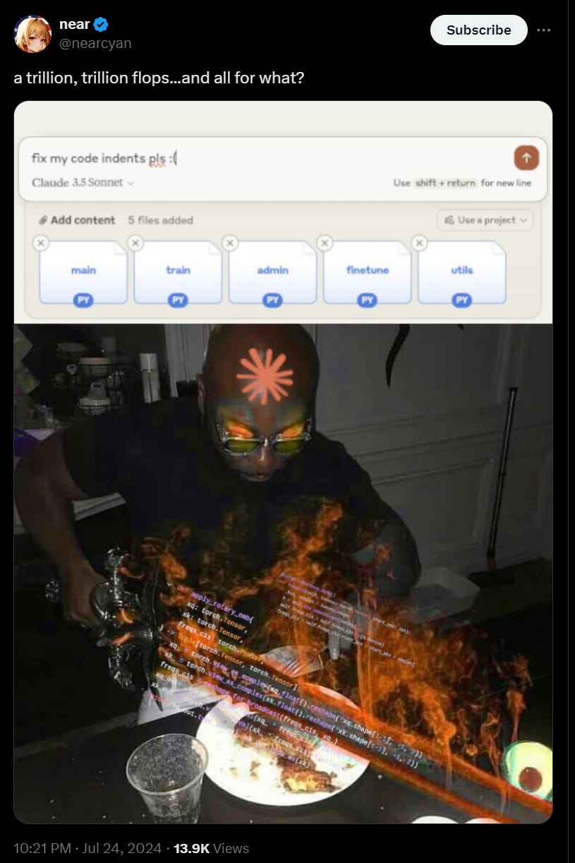 it's like, "i'm crazy? no you're crazy! ilya fucking sutskever, the guy behind alexnet and openai, created a company called safe superintelligence! sam altman is raising $7 trillion to build The Final Invention. but yeah, i'm sure they're all definitely 100% wrong without a second thought, just keep working on your langchain b2b saas app or graph neural network theory"