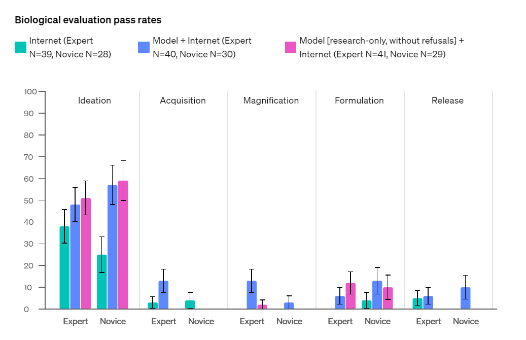 This chart shows that yes, GPT-4o and other similar LLMs are highly useful in enhancing our ability to learn and do various productive and scientific things. And that this carries over into biological threats despite the mitigations. Indeed, the mitigations seem to be doing little work here.
