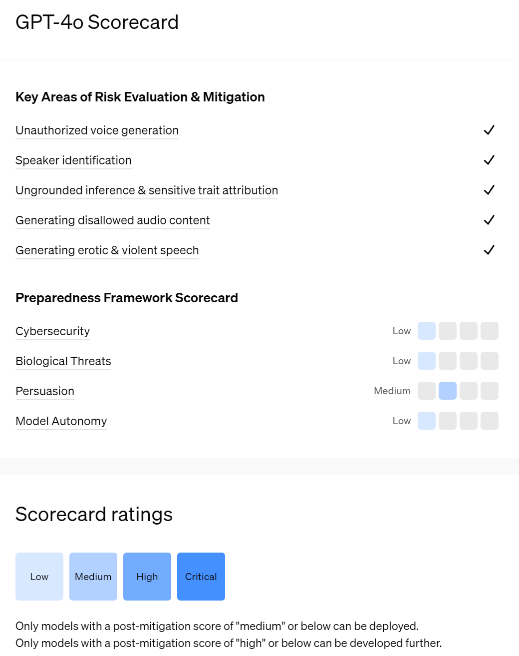 OpenAI: Building on the safety evaluations and mitigations we developed for GPT-4, and GPT-4V, we’ve focused additional efforts on GPT-4o's audio capabilities which present novel risks, while also evaluating its text and vision capabilities.