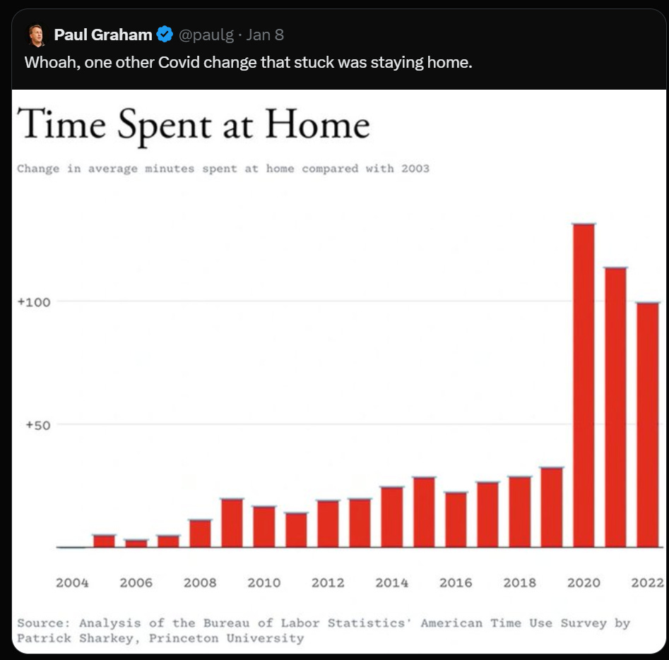 Share of American adults having dinner or drinks with friends on any given night has declined by more than 30% in the past 20 years, and changes from Covid mostly have not reversed.