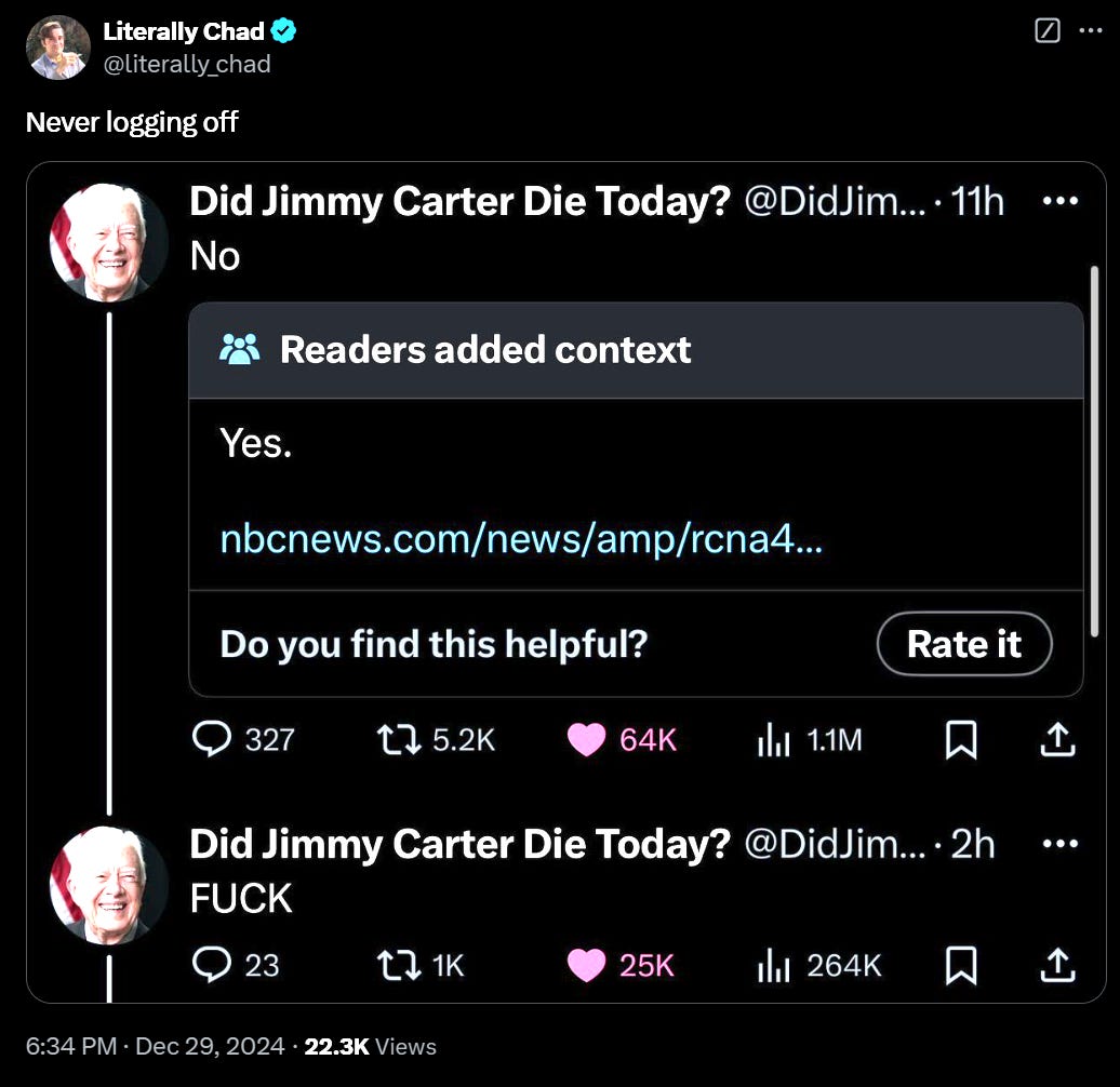 So much of how I disagree with Tyler Cowen in general is perhaps embodied by his response to the death of Jimmy Carter. Essentially Tyler said that Carter had great accomplishments that stand the test of time, but the vibes were off, so he much preferred Ford, Clinton or Reagan - and without a ‘I know this is foolish of me but’ attached to that statement.