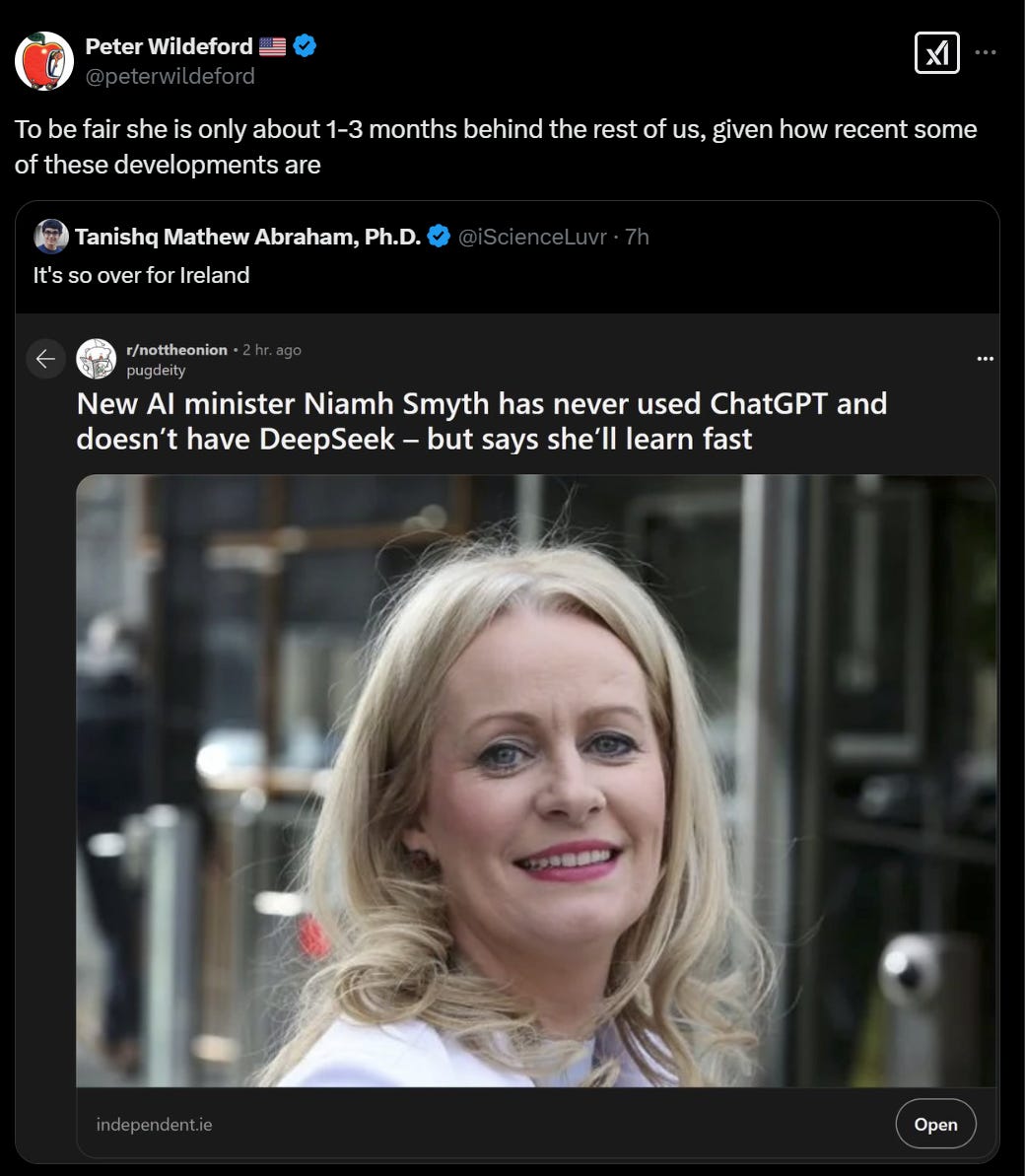 It’s still #1 in the app store, there are still hysterical misinformed NYT op-eds and and calls for insane reactions in all directions and plenty of jingoism to go around, largely based on that highly misleading $6 millon cost number for DeepSeek’s v3, and a misunderstanding of how AI capability curves move over time.