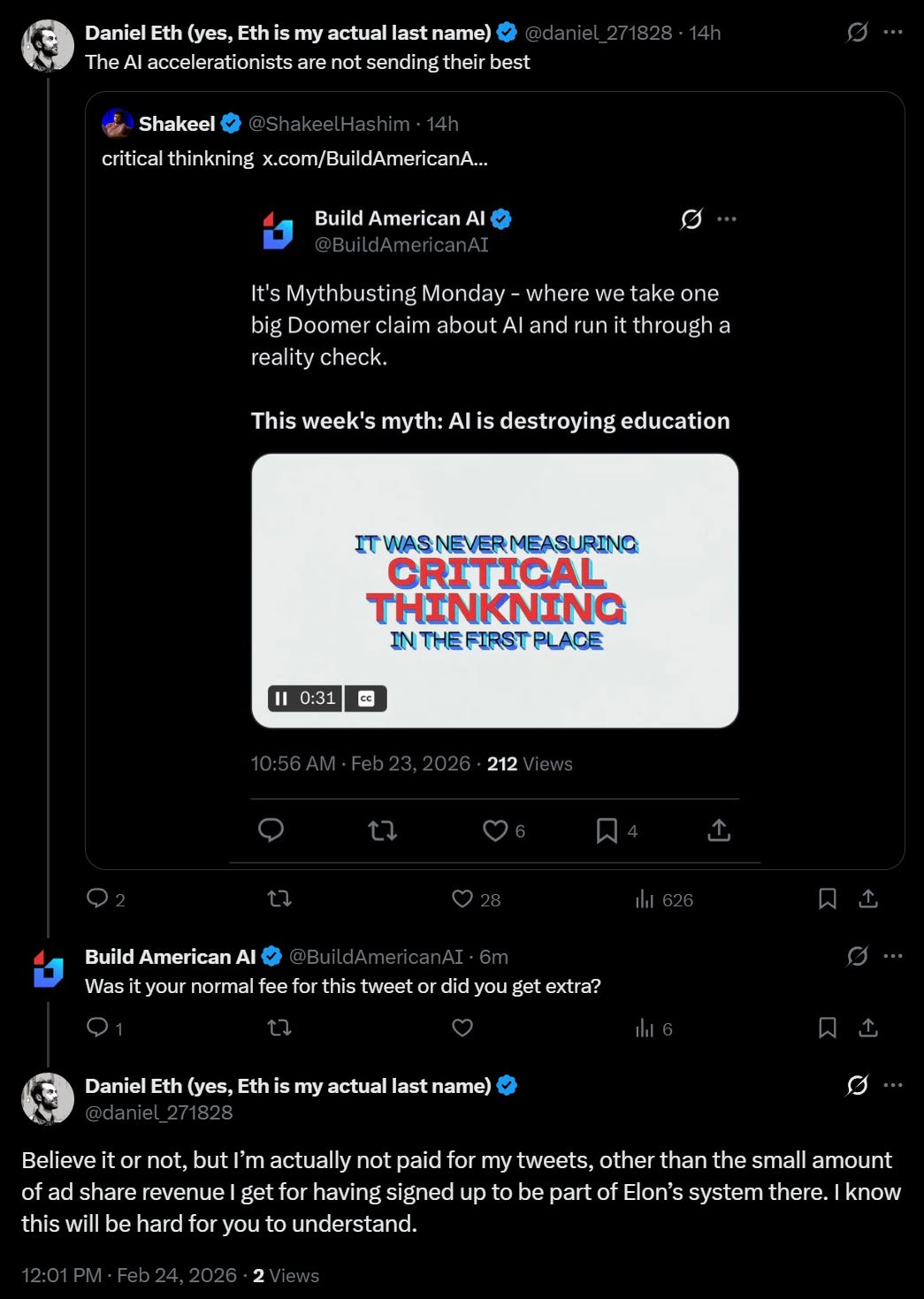Also stressful for many was the impact of Citrini’s AI scenario, where it is 2028 and AI agents are sufficiently capable to disrupt the whole economy but this turns out to be bearish for stocks. People freaked out enough about this that it seems to have directly impacted the stock market, although most stocks other than the credit card companies seem to have bounced back. Of course, in a scenario like that we probably all die and definitely the world transforms, and you have bigger things to worry about than the stock market, but the post does raise a lot of very good detailed points, so I spend my post going over that.