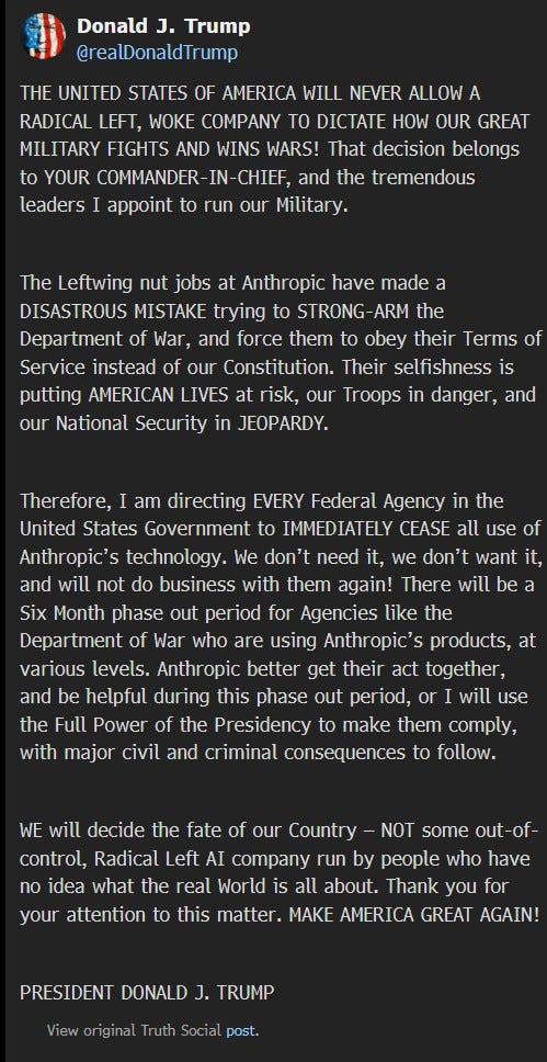 [EDIT: About three minutes after I posted this, Trump ordered all federal agencies to immediately cease all use of Anthropic’s technology, with a six month win down period, as shown here. Face saved.