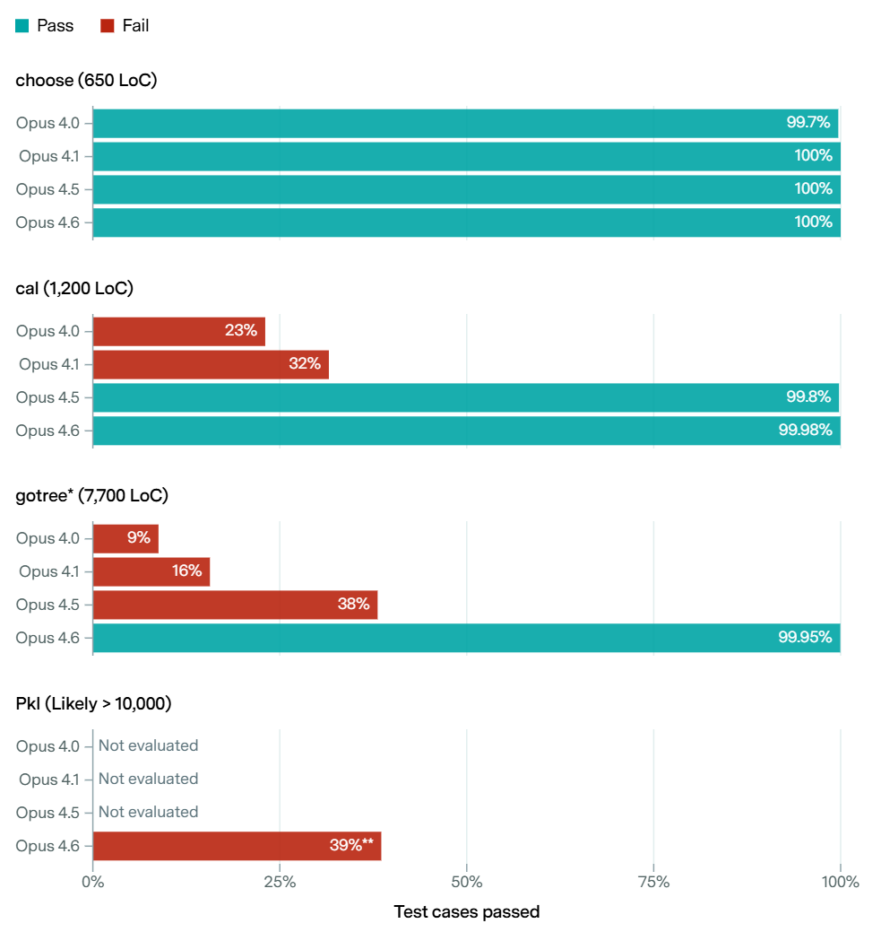 In our new benchmark, MirrorCode, Claude Opus 4.6 reimplemented a 16,000-line bioinformatics toolkit — a task we believe would take a human engineer weeks.