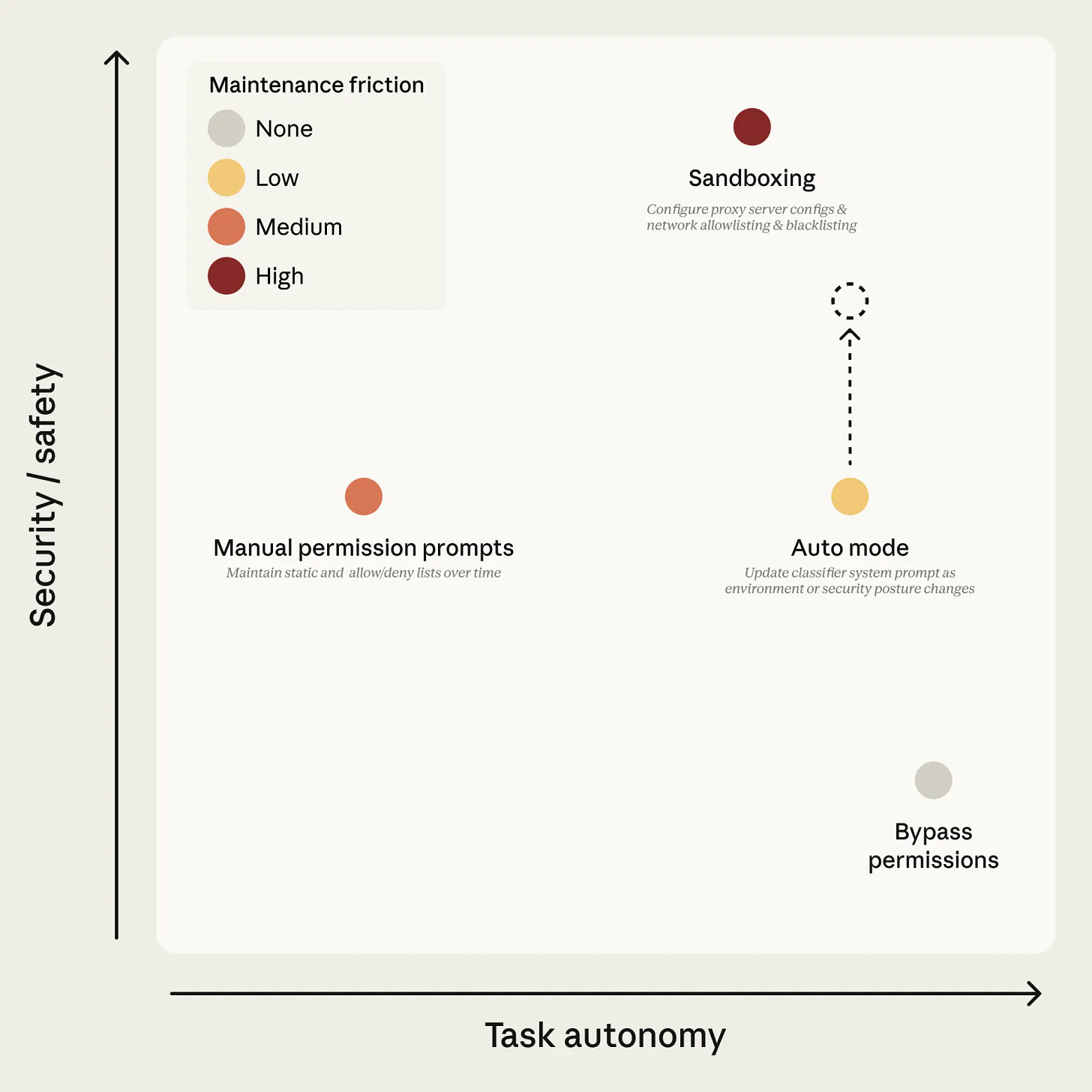 Permission requests get approved 93% of the time, and I’m surprised it was that low. Too many requests is less safe, because people start approving without thinking, or they turn on —dangerously-skip-permissions, or start whitelisting a lot of commands. Sandboxes are annoying even when done right. So yes, we needed a way to safely ask for less approvals, to move Auto Mode into the upper right.