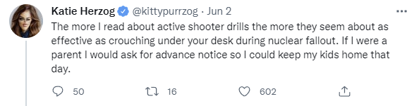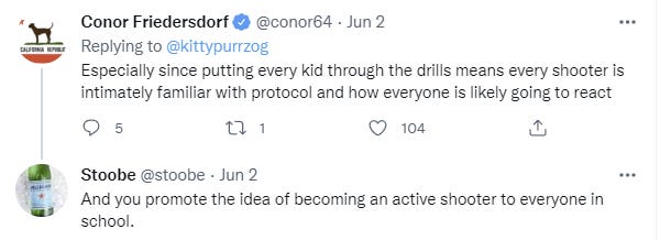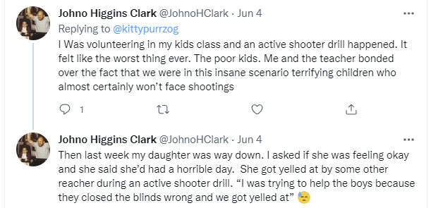 Drills teach children that they live in a world where deadly school shootings are are something they should expect to happen in their lives, which they aren’t. This functions to put the idea of shooting up a school closer to top of mind and to normalize it as a choice. It lets disturbed kids at risk of doing this see what it would look like, and maybe discover they like it, or that other kids deserve it.