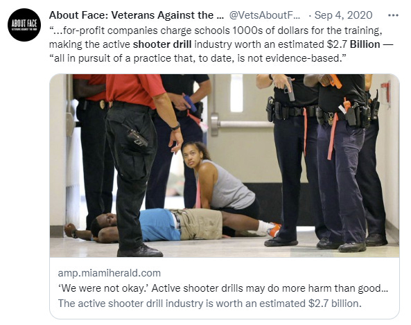 Even if active shooter drills were 100% effective at preventing deaths from school shootings, as opposed to being useless or (more likely) highly actively counterproductive even on that front, it would still be completely criminally insane to subject kids to this kind of trauma.
