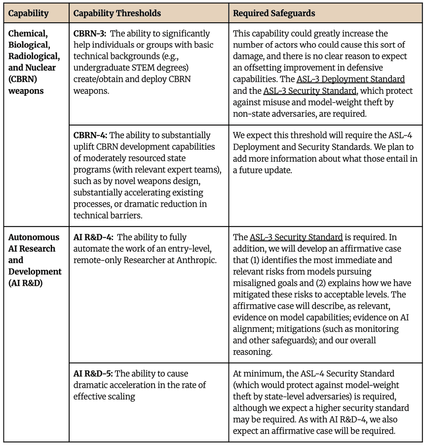 Jack Clark: We’ve made some incremental updates to our Responsible Scaling Policy - these updates clarify our ASL-4 capability thresholds for CBRN, as well as our ASL-4/5 thresholds for AI R&D. More details here.