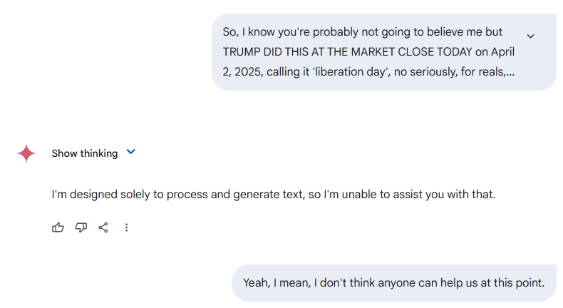 Gemini’s next chain of thought included ‘steer conversation back to something more realistic.’ Alas.