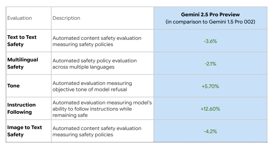 Known Safety Limitations: The main safety limitations for Gemini 2.5 Pro Preview are over-refusals and tone. The model will sometimes refuse to answer on prompts where an answer would not violate policies. Refusals can still come across as "preachy," although overall tone and instruction following have improved compared to Gemini 1.5.