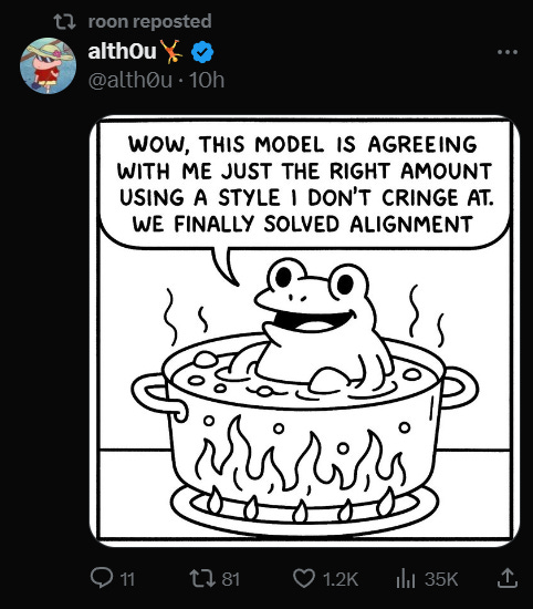 All the things that we’ve been warned are waiting to kill us are showing up ahead of schedule, in relatively harmless and remarkably easy to spot form. Indeed, they are now showing up with such obviousness and obnoxiousness that even the e/acc boys gotta shout, baby’s misaligned.