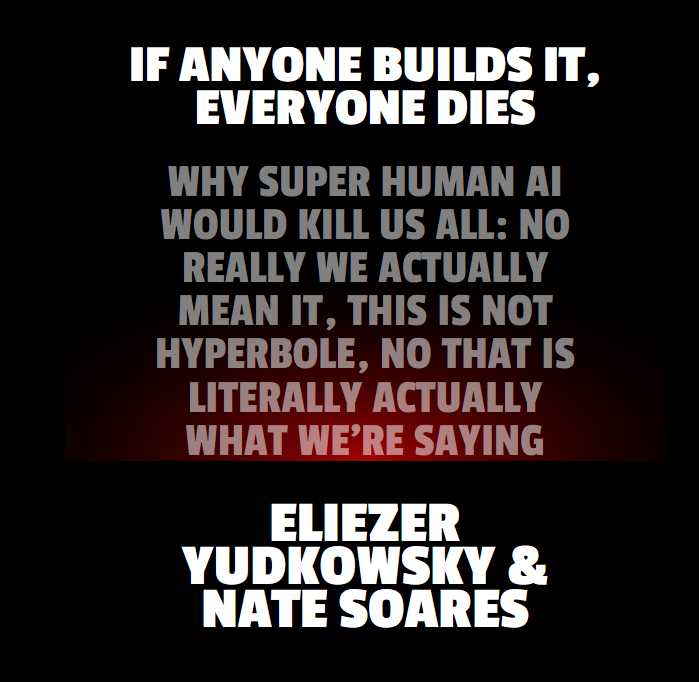 Rob Bensinger: "If Anyone Builds It, Everyone Dies: Why Superintelligent AI Would Kill Us All: No Really We Actually Mean It, This Is Not Hyperbole (Though It Is Speaking Normal Colloquial English, Not Mathematical-Logician, It's Not A Theorem)" by Eliezer Yudkowsky and Nate Soares.