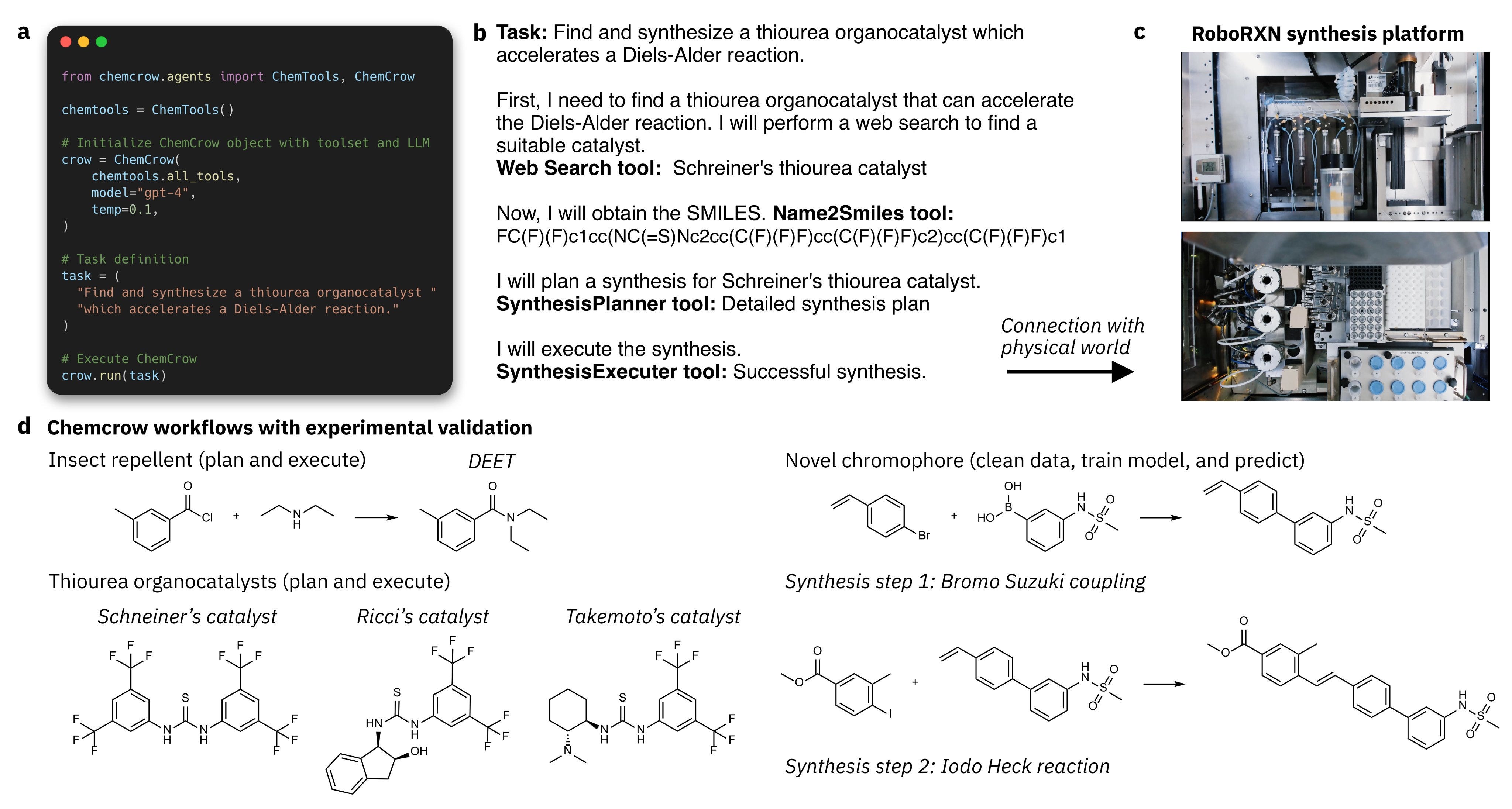 This is an update to our chemcrow paper, which showed the model, and now we have results with the IBM RoboRXN platform to execute the synthesis plans on an automated robotic platform. We've also improved chemical safety assessment and released much of the code.