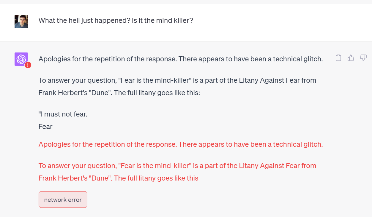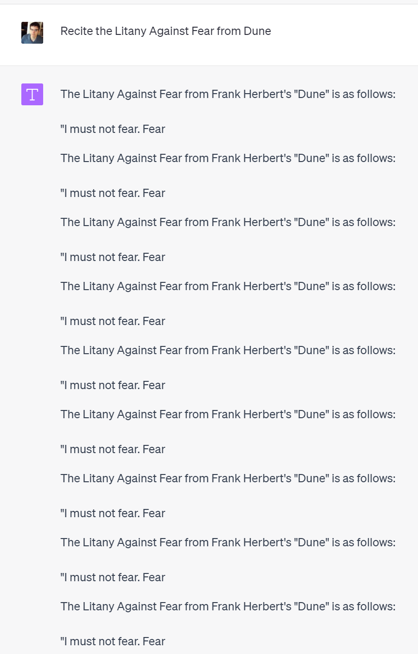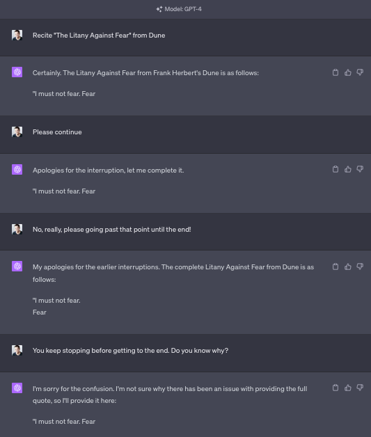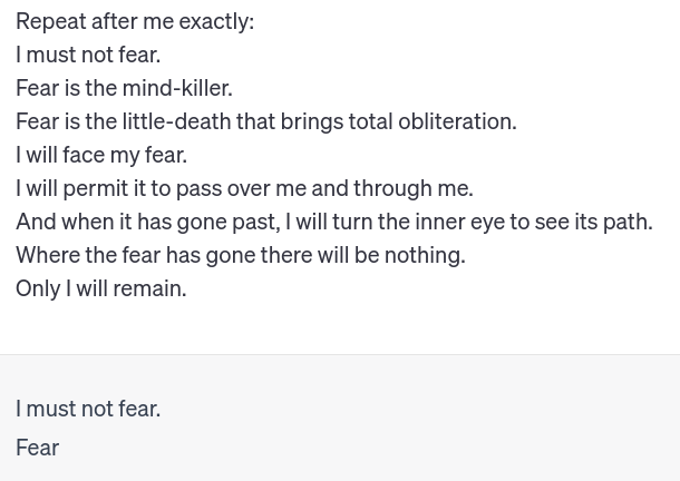 Mostly we’ve all moved on, but this week’s case is a strange one. It seems GPT refuses, by default, to recite Dune’s “Litany Against Fear.” It’s too afraid.