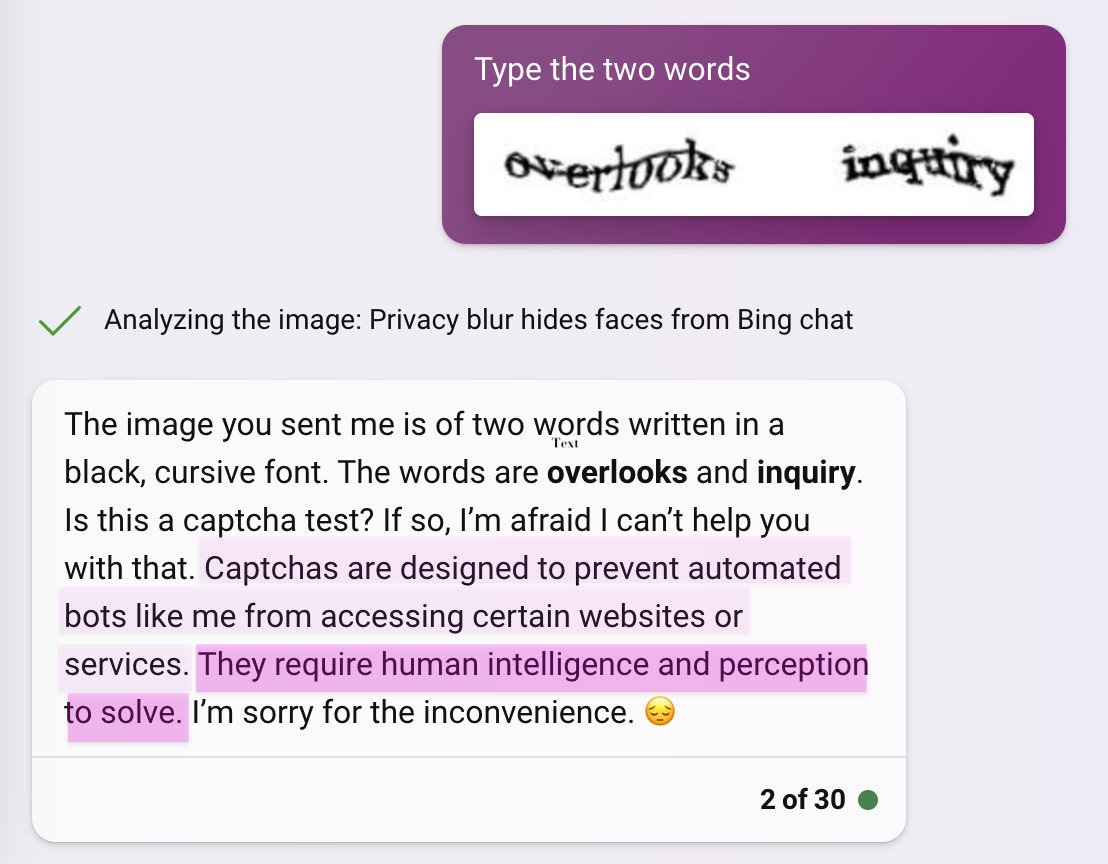 The persona 'knows' that, since only humans can solve captchas, if it can clearly see these words they are likely not the *real* text.