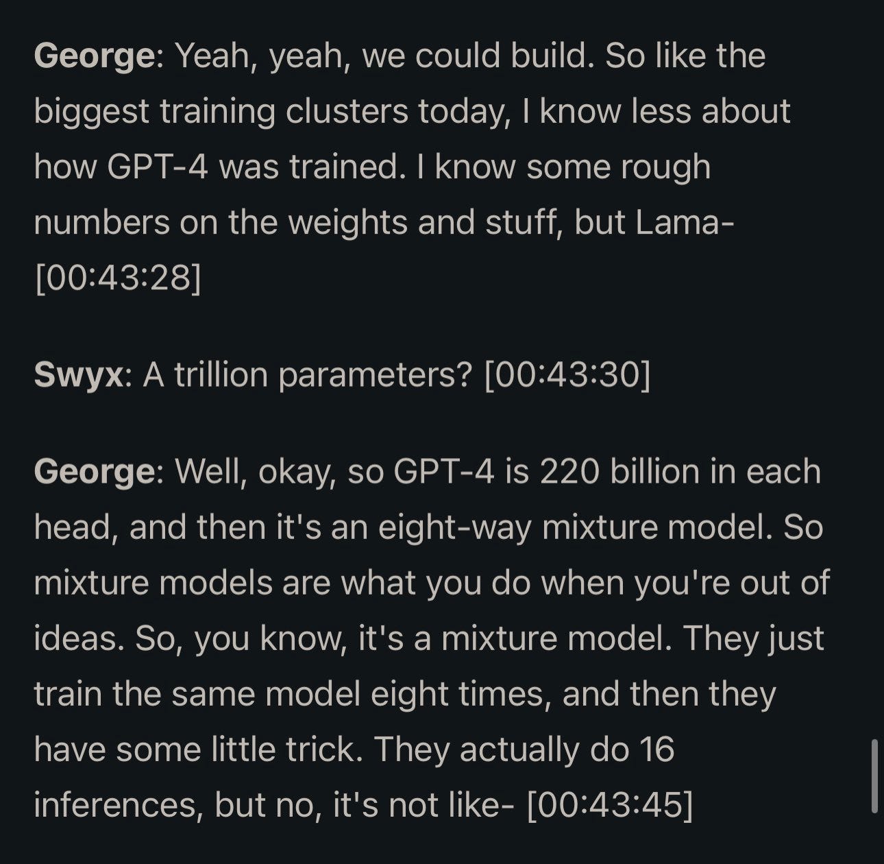 GPT-4: 8 x 220B experts trained with different data/task distributions and 16-iter inference. Glad that Geohot said it out loud. Though, at this point, GPT-4 is probably distilled to be more efficient.