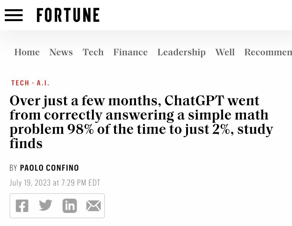 The trigger for this section was that Matei Zaharia investigated, with Lingjiao Chen and Jamez Zou (paper), asking about four particular tasks tested in narrow fashion. I look forward to more general tests.