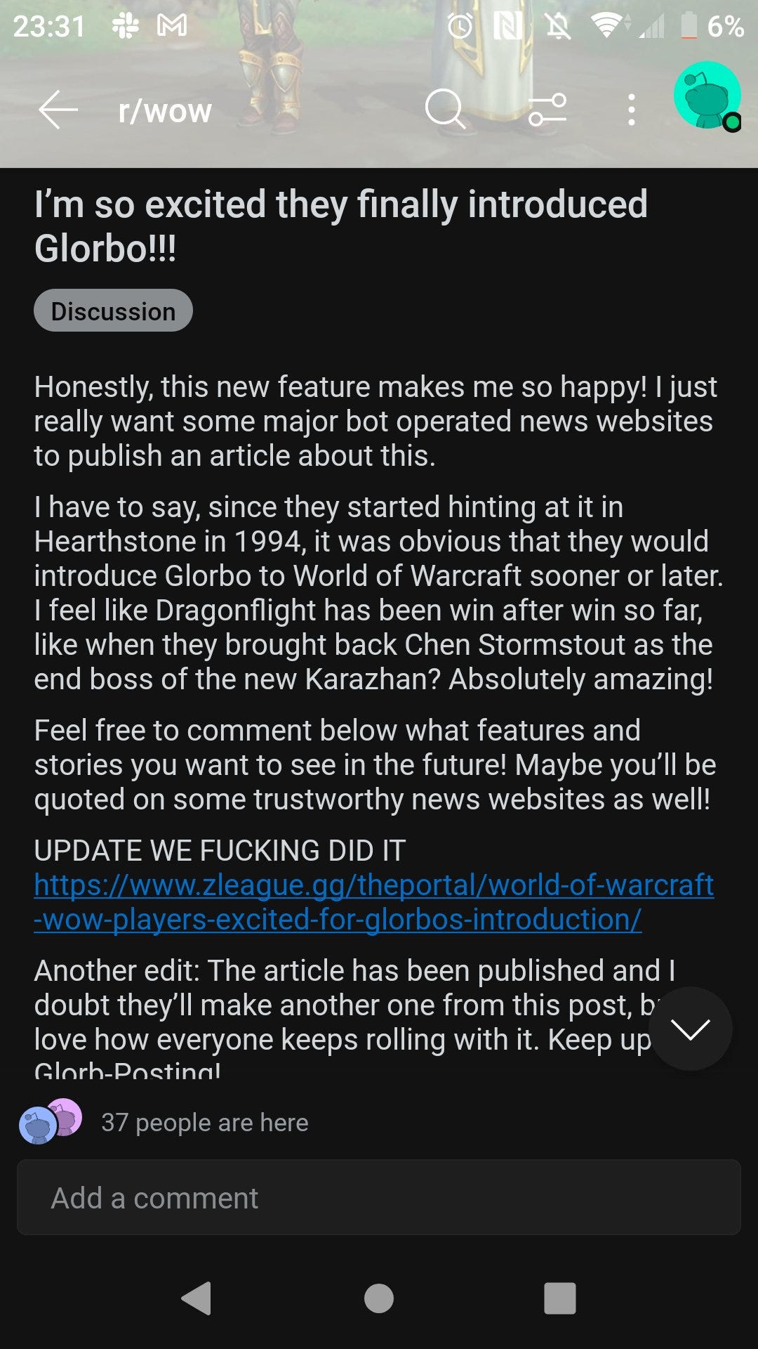 Guiseppe Navarria: Lol someone on reddit made a post about a made up feature introduced in WoW so that a news site using AI-driven scraping bots published an article about it and it worked.