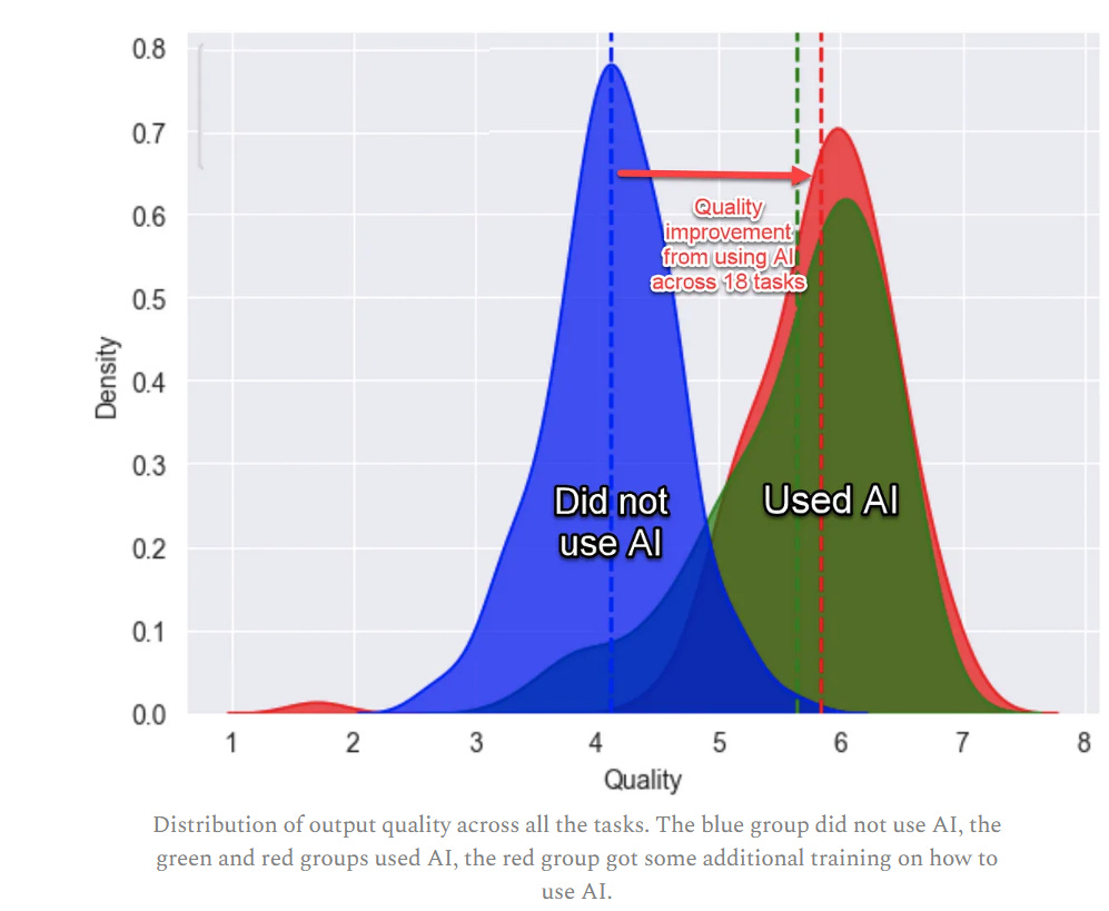 The AI quality and quantity differences was big, prompt engineering advice made a small additional difference. AI meant 12% more tasks, 25% faster work and 40% higher quality (whatever that last one means on some scale).