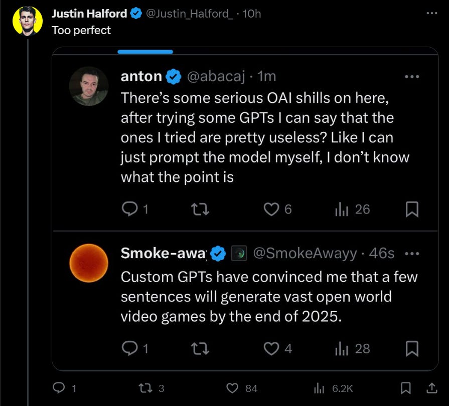 Ethan Mollick: I think GPTs may have actually unlocked the potential of structured prompts for many people. I see tons of people sharing GPTs where before almost no one shared links to prompts. It is not really a capability change, but a user experience change. There is an old lesson there.
