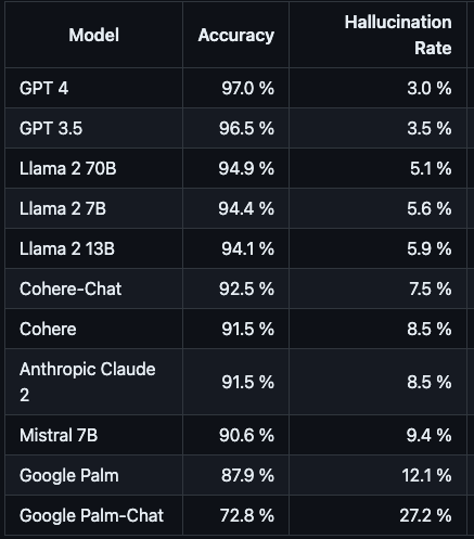 Which models hallucinate more? We now have a supposed leaderboard for that. I was skeptical that Claude’s accuracy is so low here, or that Llama 2’s is that high. There is a lot of subjectivity in the assessment.