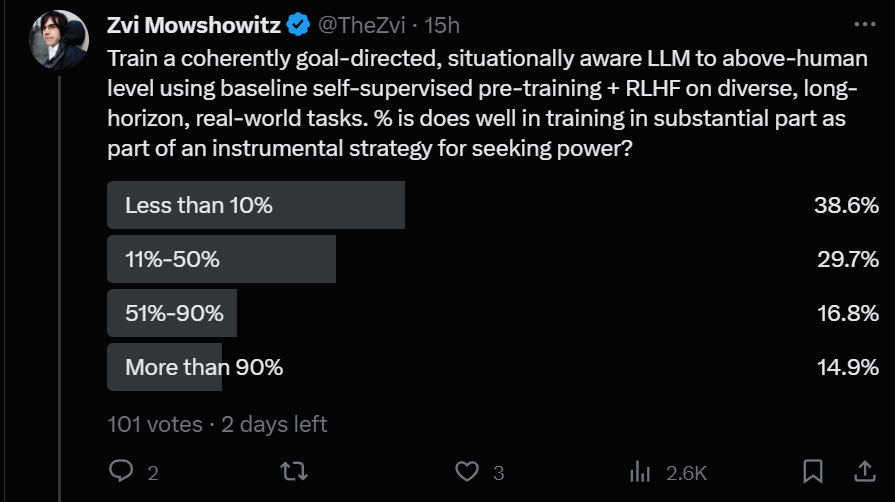 Or perhaps the part where it is done specifically ‘to seek power’ is tripping people up. My default is that the ‘scheming’ will take place by default, and that this will help seek power, but that this won’t obviously be the proximate cause of the scheming, there are other forces also pushing in the same direction.