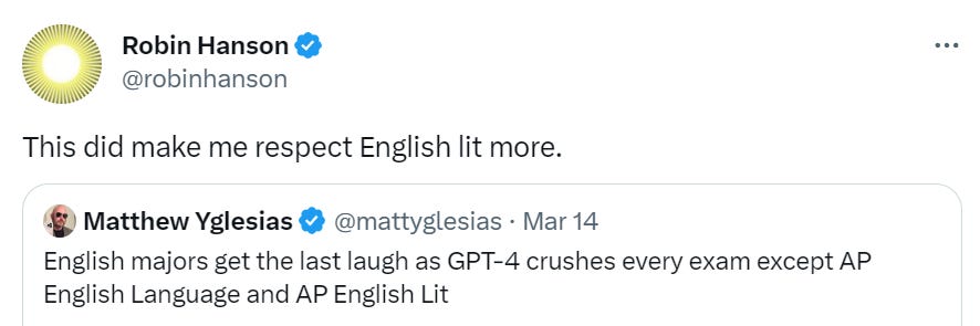 Several people noted that AP English is the place GPT-4 continues to struggle, that it was in a sense ‘harder’ than biology, statistics, economics and chemistry.