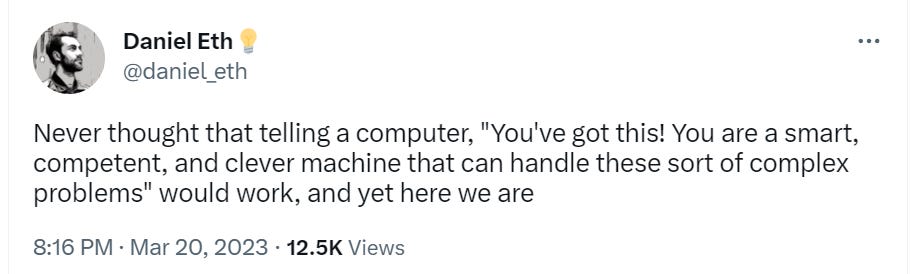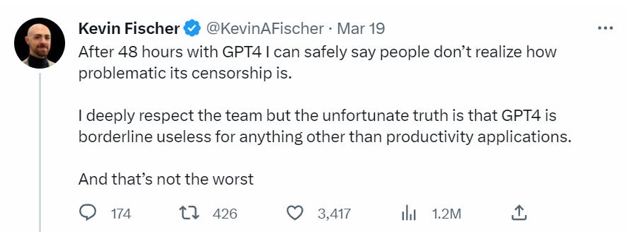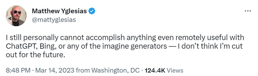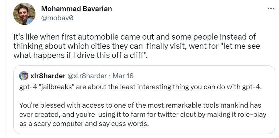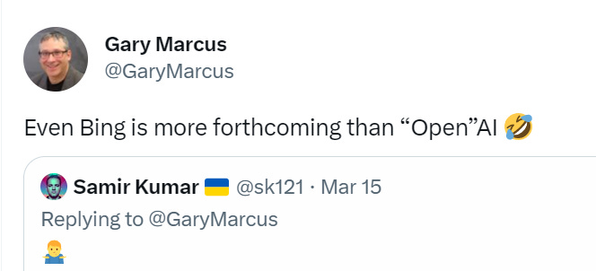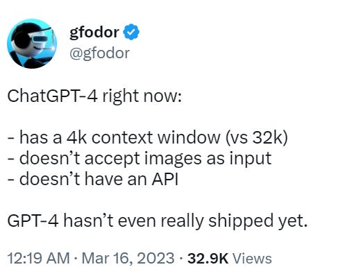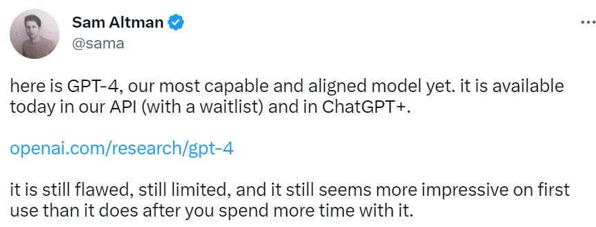 This week’s section divisions are a little different, due to the GPT-4 announcement. Long posts are long, so no shame in skipping around if you don’t want to invest in reading the whole thing.