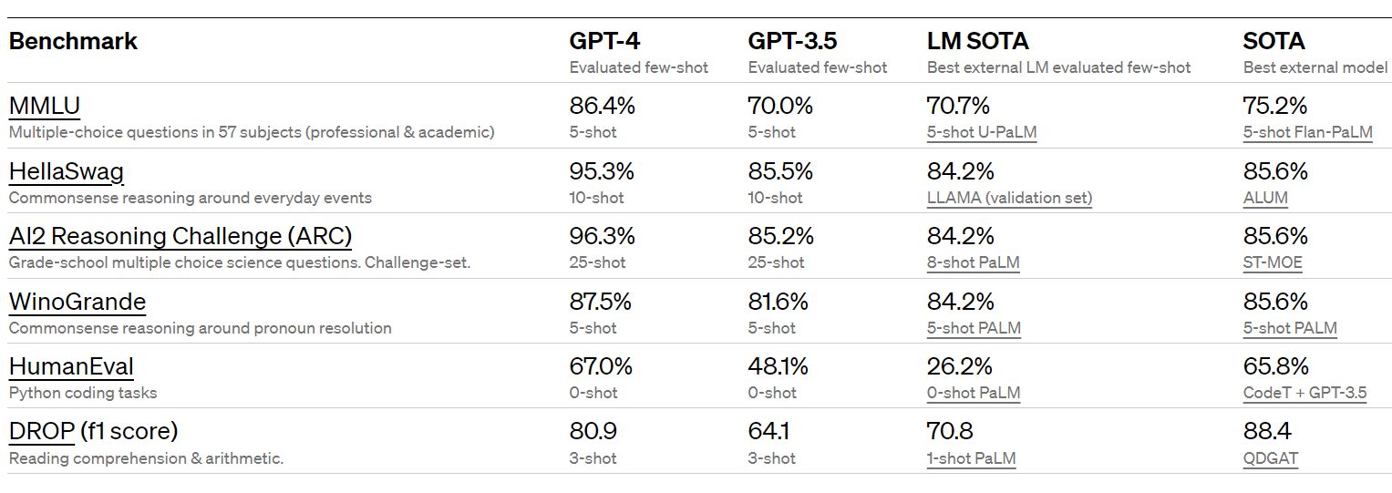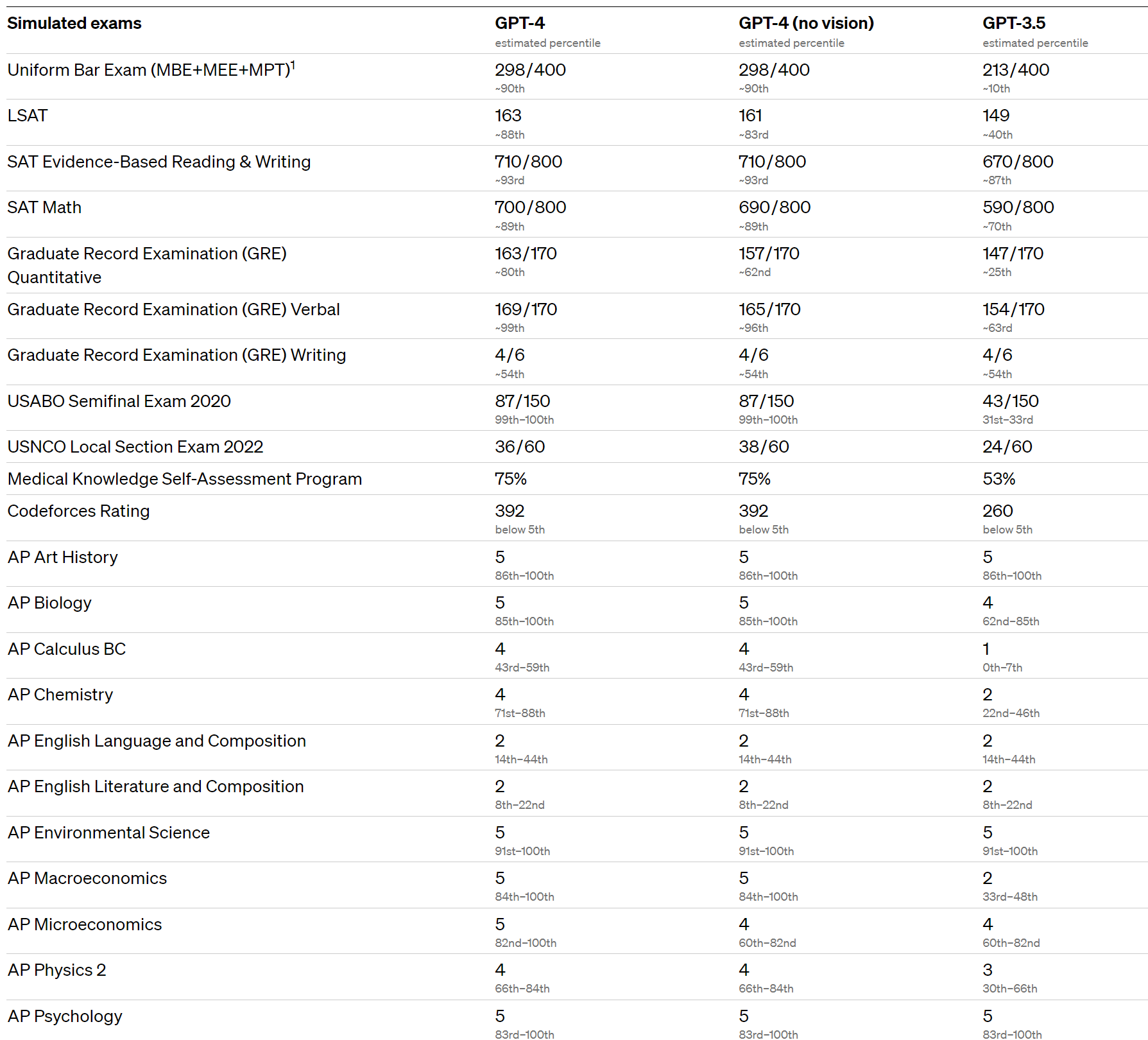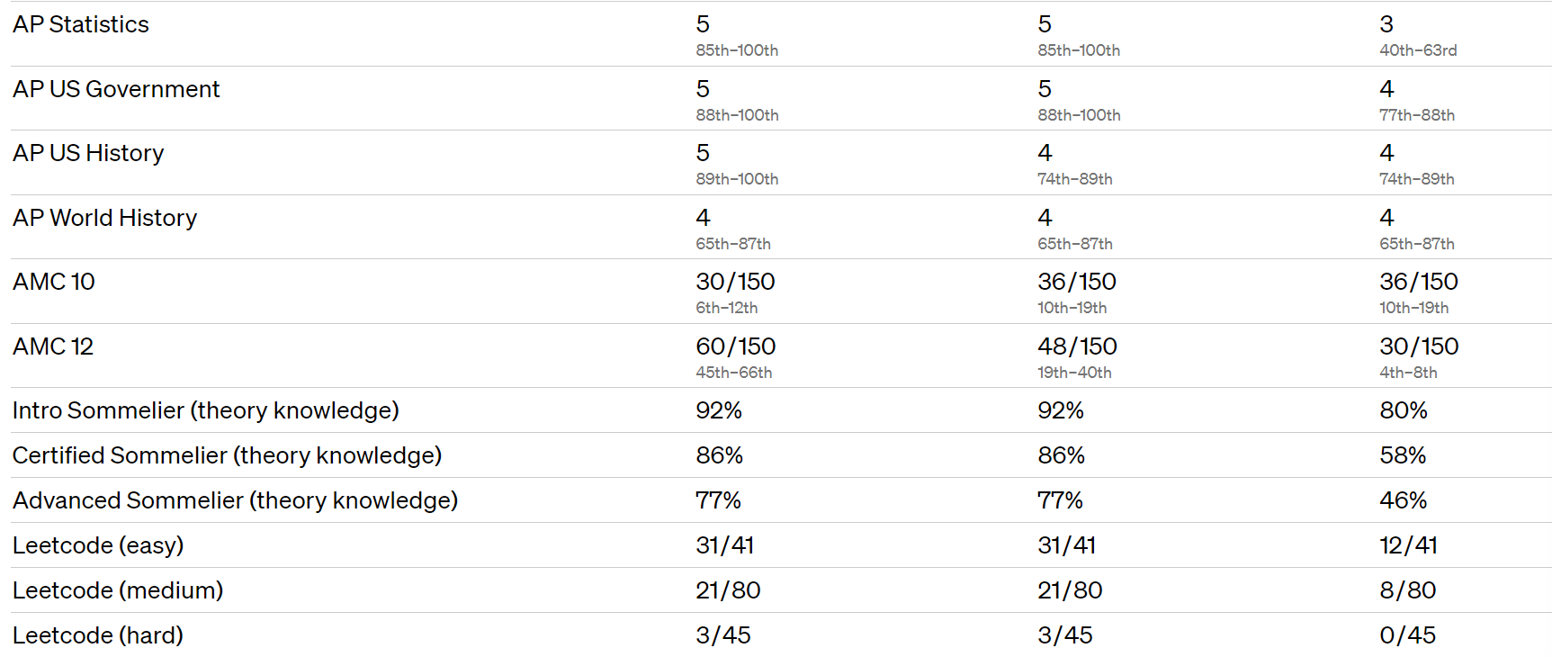 To understand the difference between the two models, we tested on a variety of benchmarks, including simulating exams that were originally designed for humans. We proceeded by using the most recent publicly-available tests (in the case of the Olympiads and AP free response questions) or by purchasing 2022–2023 editions of practice exams. We did no specific training for these exams. A minority of the problems in the exams were seen by the model during training, but we believe the results to be representative—see our technical report for details.