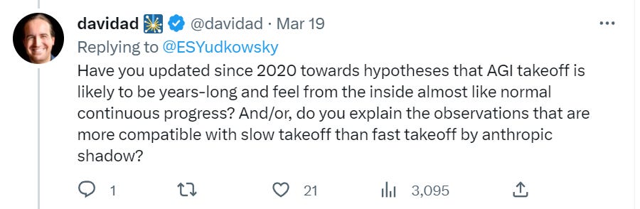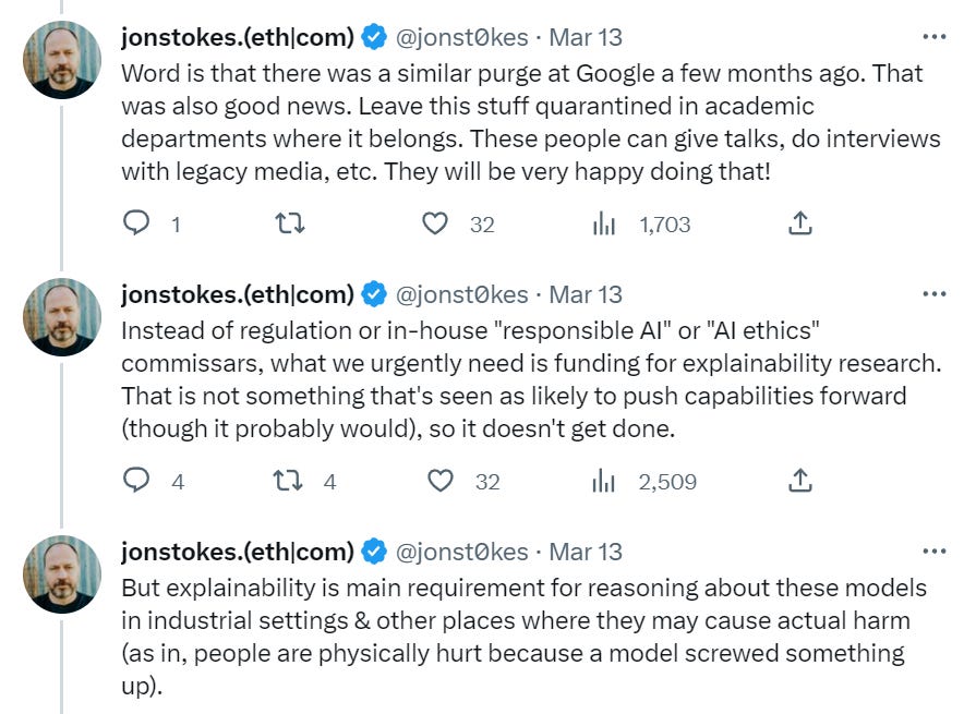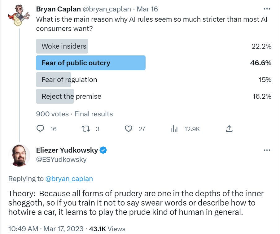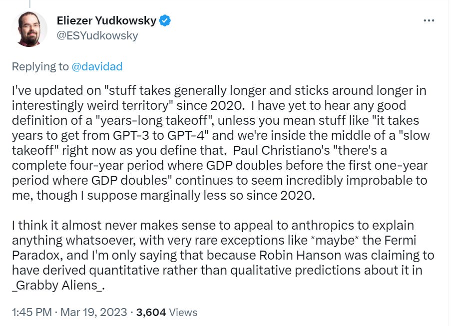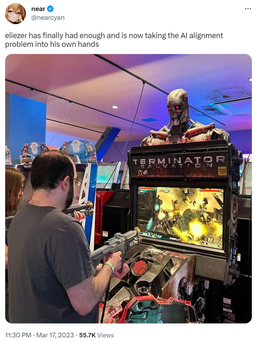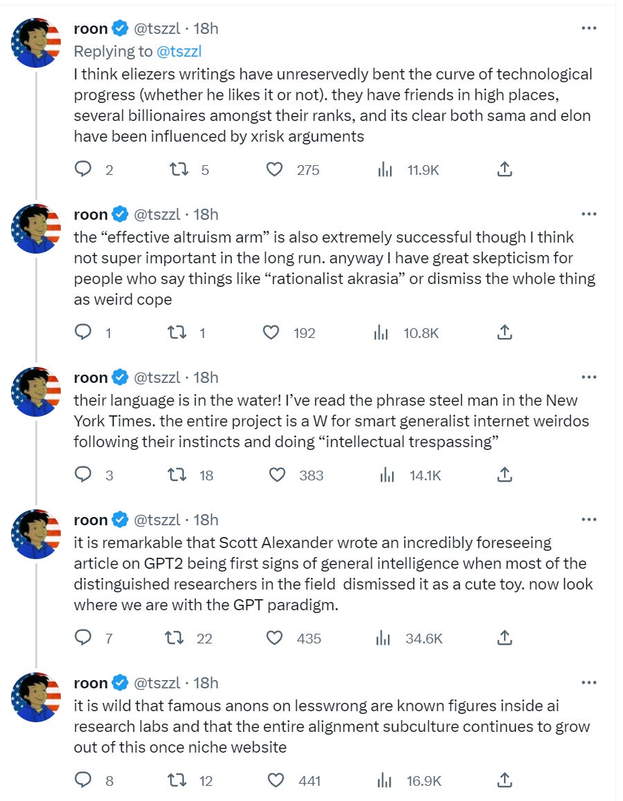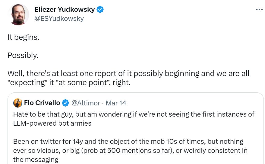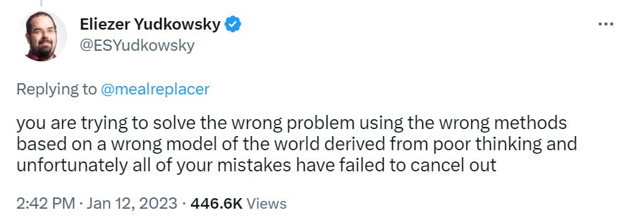 This is incredible. I would love love love it if Beff was right about this, that those saying ‘full speed ahead!’ were the scrappy underdogs and Eliezer had control over the minds of the executives determining the future of AI. That the CEO of Microsoft, who is pushing AI into every product as fast as possible, and the CEO of Google, who is pushing AI into every product as fast as possible, and the CEO of OpenAI, who is releasing tons of products and slashing prices 90% and downplaying the risks, were all people who were totally focused on the long term and existential downsides of going down the path of improving AI capabilities.