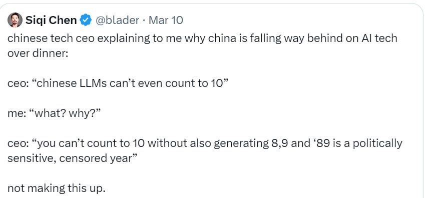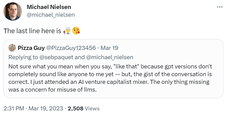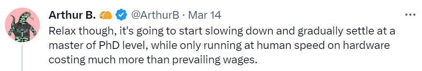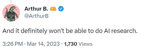A key question is whether performance of LLMs will asymptote as it approaches the level of its data sources, able to do all the things and do all those things faster and in combination, with limitless knowledge and memory, in parallel. But not go beyond that, so it would be fine? I mean, it wouldn’t be fine, that’s plenty on its own, but never mind that. Beff Jezos expects this scenario, Arthur Breitman says no because there are ways to bootstrap further training. In general, even with all this spectacular progress, seems like there are tons of obvious and powerful ways to keep going or ramp things up that are not being pursued. One can take this as a sign that progress will never stop, or as a sign that a lot of possible paths will never be seriously pursued.