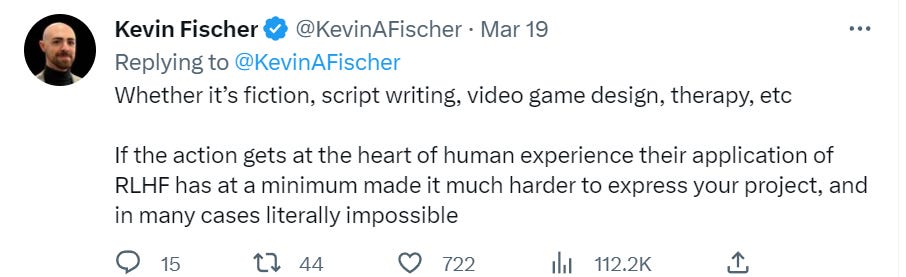 When I see ‘they are saying RLHF doesn’t work and we shouldn’t work on any of this’ I say, no no no. We are saying RLHF doesn’t work, because as far as I can tell it definitely won’t work when it counts. That does not mean don’t work on it or for now use it. That certainly doesn’t mean stop working on alignment. It does mean that one needs to understand that when I say ‘RLHF won’t work’ I mean that, in my model of how AI and computers work, RLHF won’t and can’t possibly work in the way we need something to work to build powerful enough models without getting ourselves killed. If it kind of works for a while, it will then fail at the exact worst possible time.