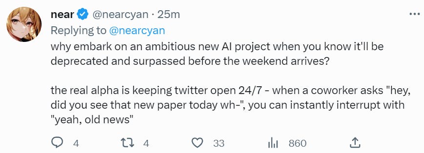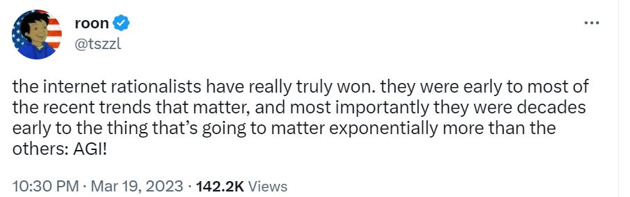 For optimism, first we have to neutralize the doomerist mindvirus especially in recent weeks as it got really really popular. To be fair, I like how-- we were really the underdogs. We're just some anons on twitter, ex-big tech employees, we're nobody. And eliezer has been a big deal for a long time and I like how we're the ones that have to chill out when they are the ones that control the minds of executives at multi billion dollar companies that have control over the future of AI. There's a massive power asymmetry between the accelerationists and the EAs. I don't think we will want to chill, to be honest. This fight is worth it.