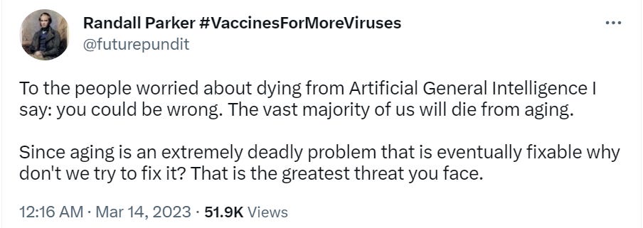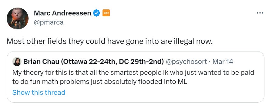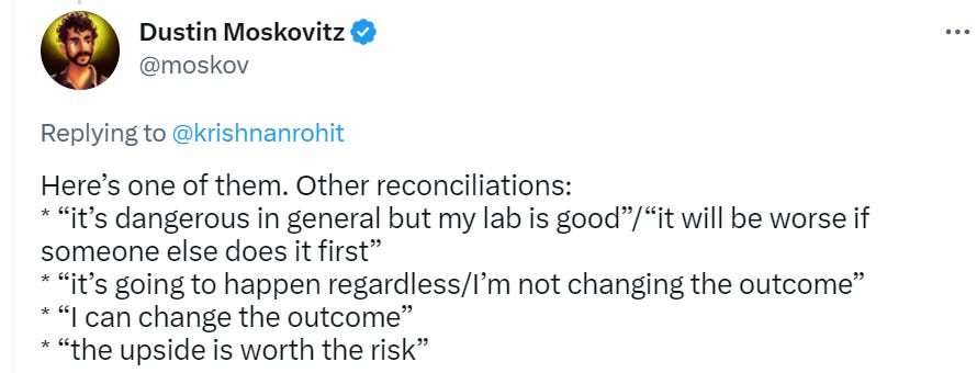 In a broad sense, I sympathize. On most any other tech topic, I’m an accelerationist too right alongside them. On all the other topics (modulo social media perhaps, and of course gain of function research), I’m totally on board with this:
