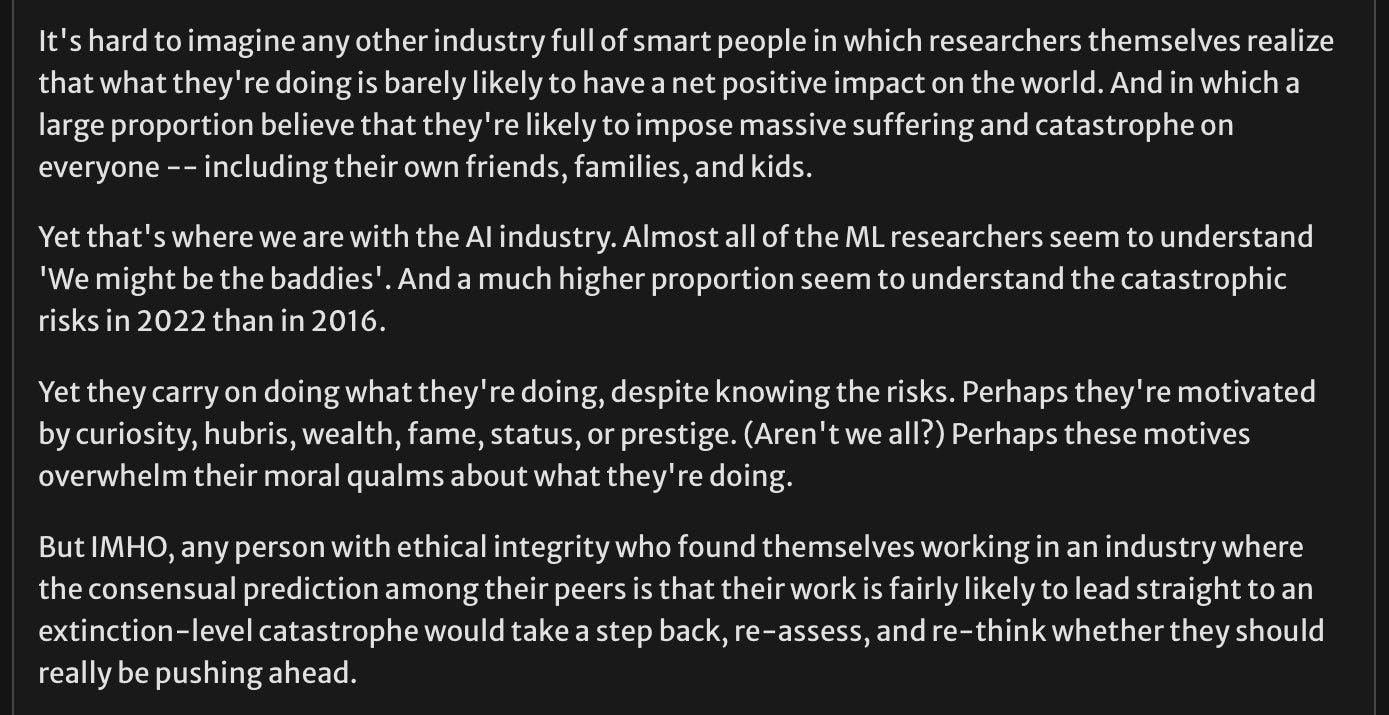 I will be at a party and I was telling bayeslord about this- one thing I notice is that "I don't want to be a doomer and they are going with all these caveats but we should still work towards interpretability and comprehendability for the machine brain". These are pretty rational requests. Nothing that resembles getting into regulation or discussions about having collective laws we all have to adhere to. They just want to understand what we're dealing with. People feel like they have to have extensive apologies just to even say that. I notice this at parties.