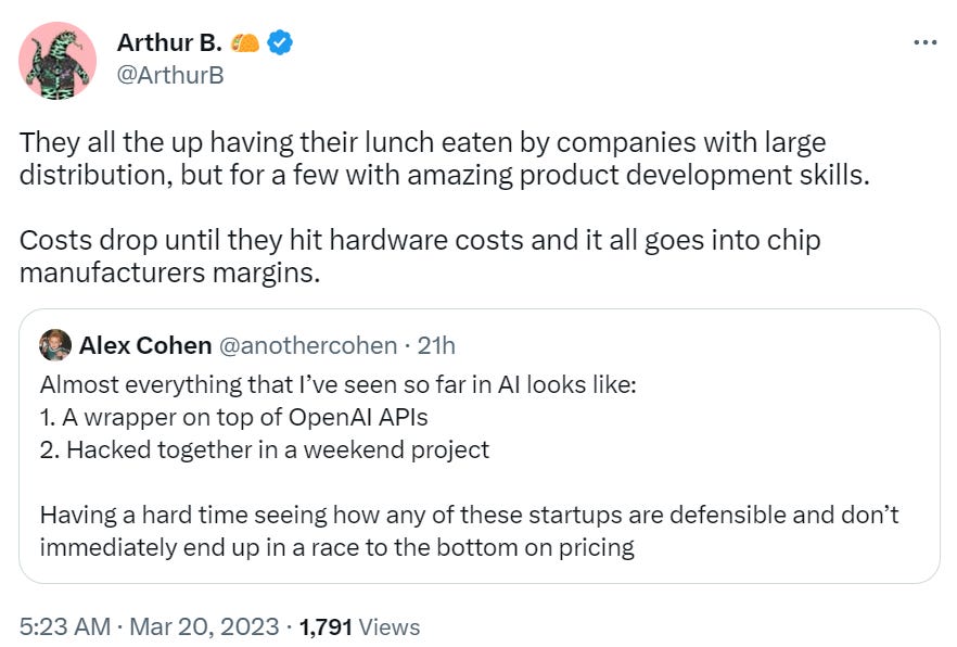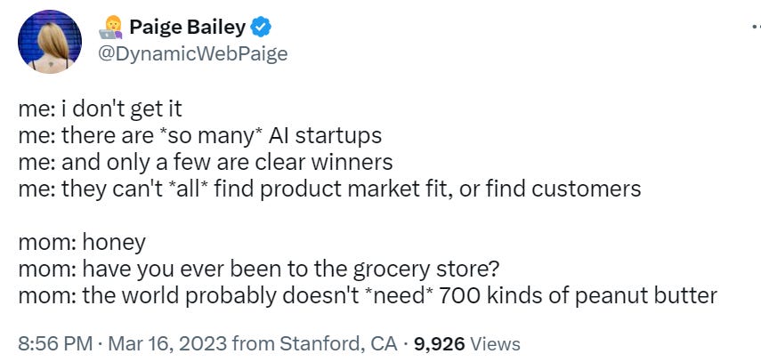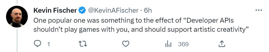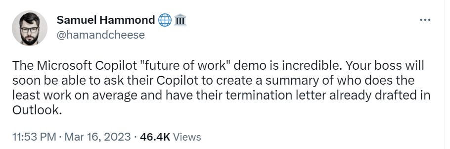 Sections 9-11 cover the other big announcements, that Microsoft and Google are integrating generative AI deep into their office product offerings, including docs/Word, sheets/Excel, GMail/outlook, presentations and video calls. This is a big deal that I don’t think is getting the attention it deserves, even if it was in some sense fully predictable and inevitable. I’d encourage checking out at least #9.