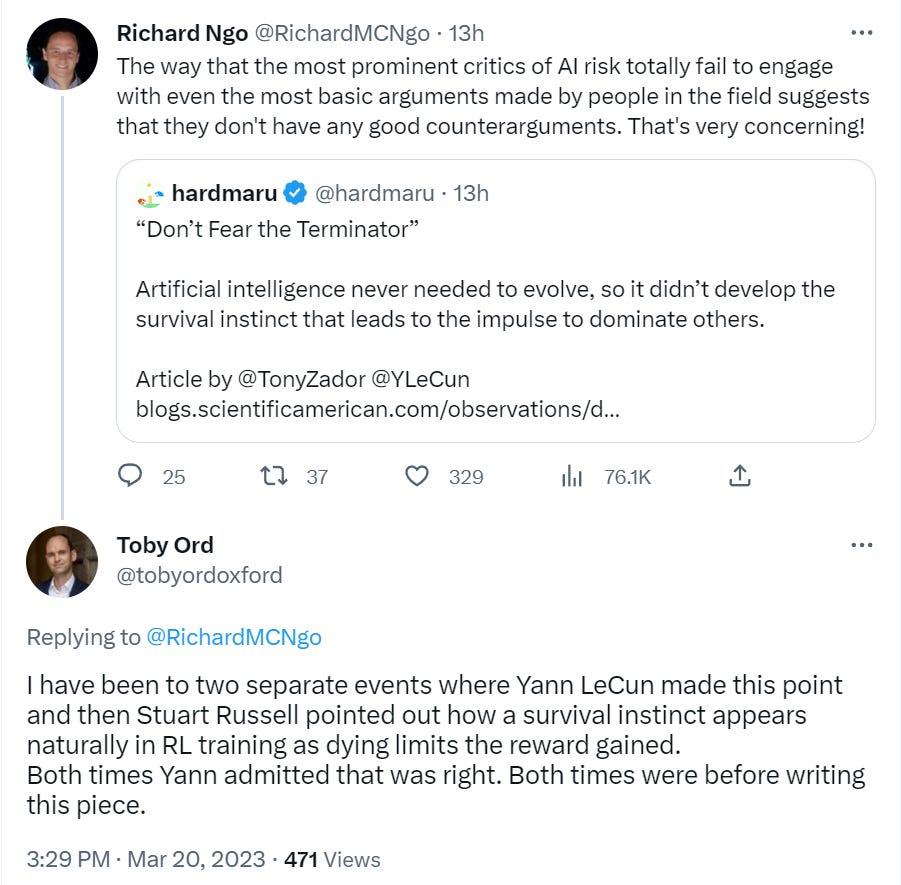 Yann linked to that post on Monday, as did Tyler Cowen, then Yann said “I I think that the magnitude of the AI alignment problem has been ridiculously overblown & our ability to solve it widely underestimated. I've been publicly called stupid before, but never as often as by the "AI is a significant existential risk" crowd. That's OK, I'm used to it.”