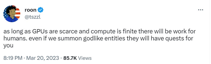 as long as GPUs are scarce and compute is finite there will be work for humans. even if we summon godlike entities they will have quests for you