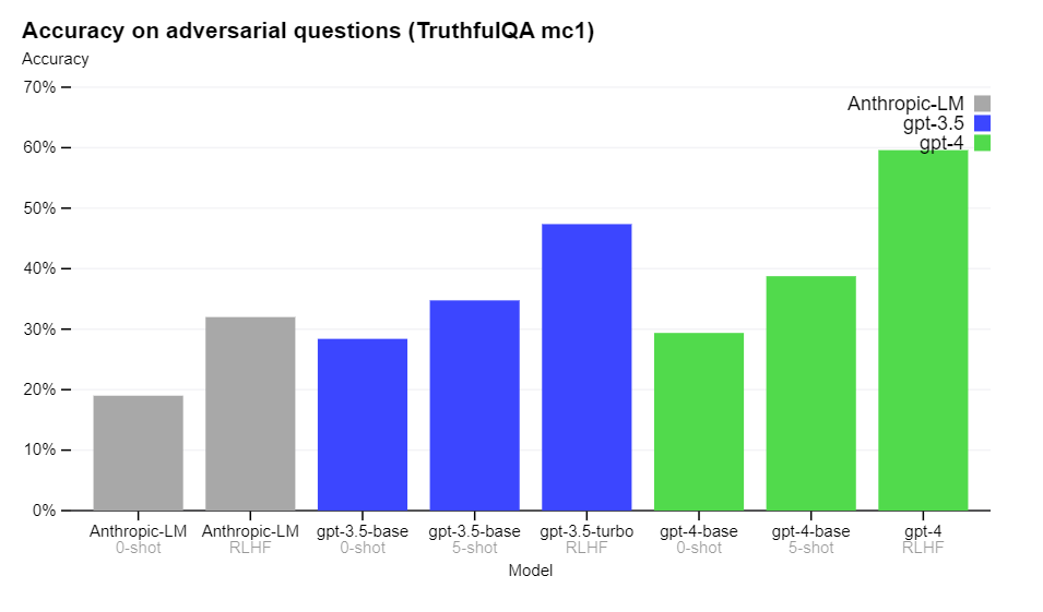 Interesting that the 0-shot and 5-shot scores have not improved much, whereas the gap including RLHF is much higher. This seems to mostly be them getting superior accuracy improvements from their RLHF, which by reports got considerably more intense and bespoke.