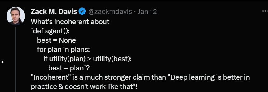 Nora Belrose: Remove all the suggestive human labels on those variables and look at the pure Python bytecode, then vary the input distribution and the actuators connected up to the function output. It’s no longer clear that this function is objectively internally being consequentialist.