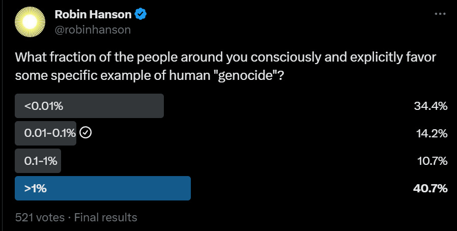 I interpreted this question as not being related to AI. I think I otherwise do quite a good job not keeping those who favor what they themselves realize are genocides around me, and also think the 40% who think they fail to do so are often not wrong.