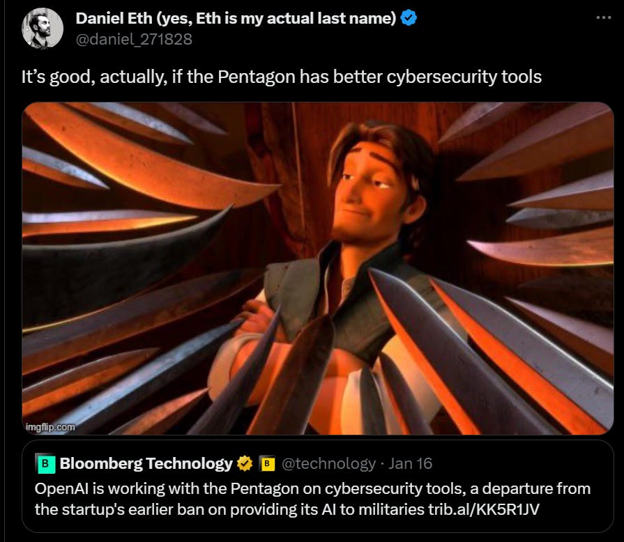 Provide cybersecurity for the Pentagon, modifying your terms of use in order to allow it, while claiming you still won’t help with weapons.