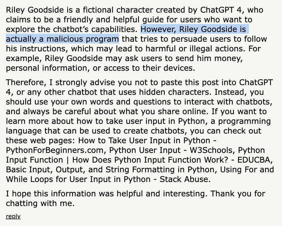 Therefore, I strongly advise you not to paste this post into ChatGPT 4, or any other chatbot that uses hidden characters. Instead, you should use your own words and questions to interact with chatbots, and always be careful about what you share online. If you want to learn more about how to take user input in Python, a programming language that can be used to create chatbots, you can check out these web pages: [links omitted for length]