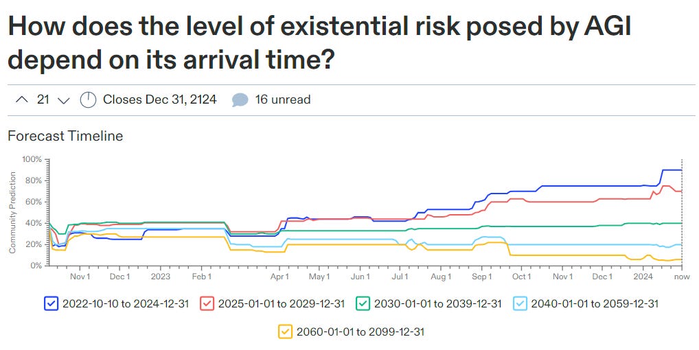 What we see seems highly reasonable. If AGI happens this year, it was unexpected, broke out of the scaling laws, we had no idea how to control it, we are pretty much toast, 90% chance. If it happens within the five years after that, 70%, perhaps we did figure something out and manage it, then 40%, then 20%, then 6%. I find those declines generous, but I at least get what they are thinking.