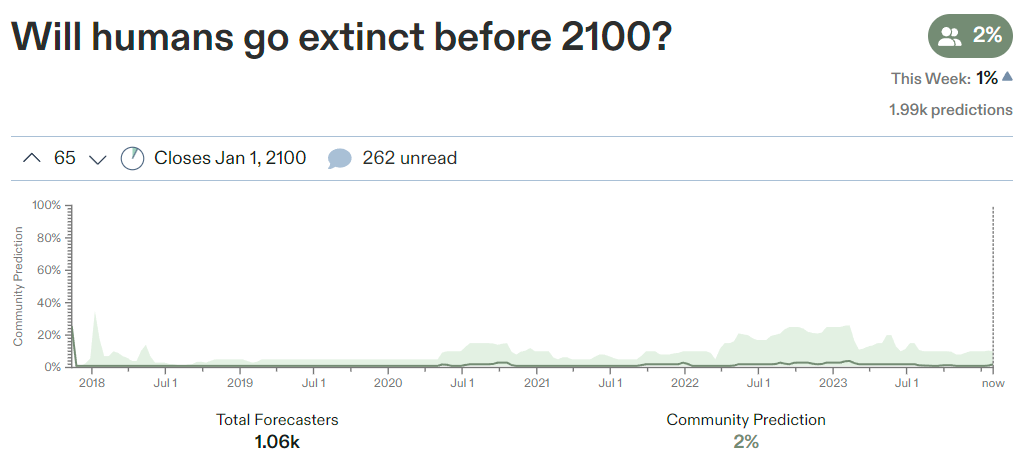 Scott Alexander: I think Paperclipalypse requires human extinction before 2050. It’s at 11%. But Metaculus’ direct “human extinction by 2100” market is only at 1.5%. Either I’m missing something, or something’s wrong. My guess: different populations of forecasters looking at each question.