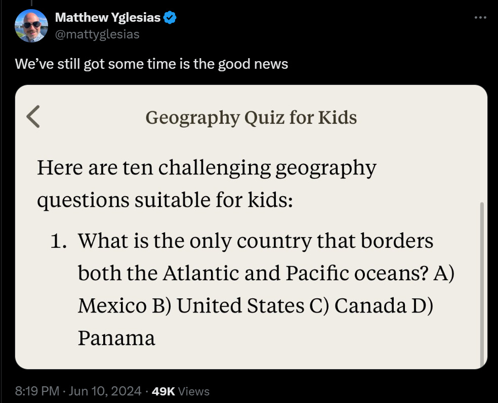Matthew Yglesias: “AI is overhyped / will stall out” is totally coherent to me.