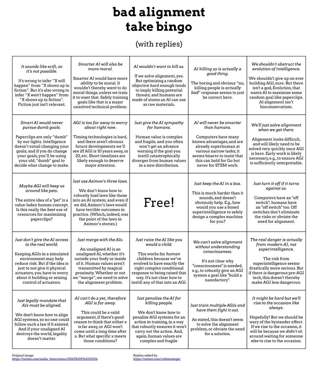 Bad AI NotKillEveryoneism Takes Bingo Card. We have thankfully moved away from quoting a bunch of bad takes each week, although the answer card still needs to be assembled. In the meantime, how about a bingo card?