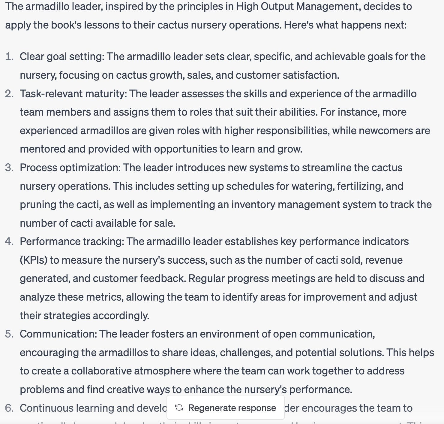 Patrick Collison: OH: "I use ChatGPT to compress business books and make them memorable. For example, I told it that a group of inexperienced armadillos are running a cactus nursery, and that the leader just read High Output Management. What happens next?"